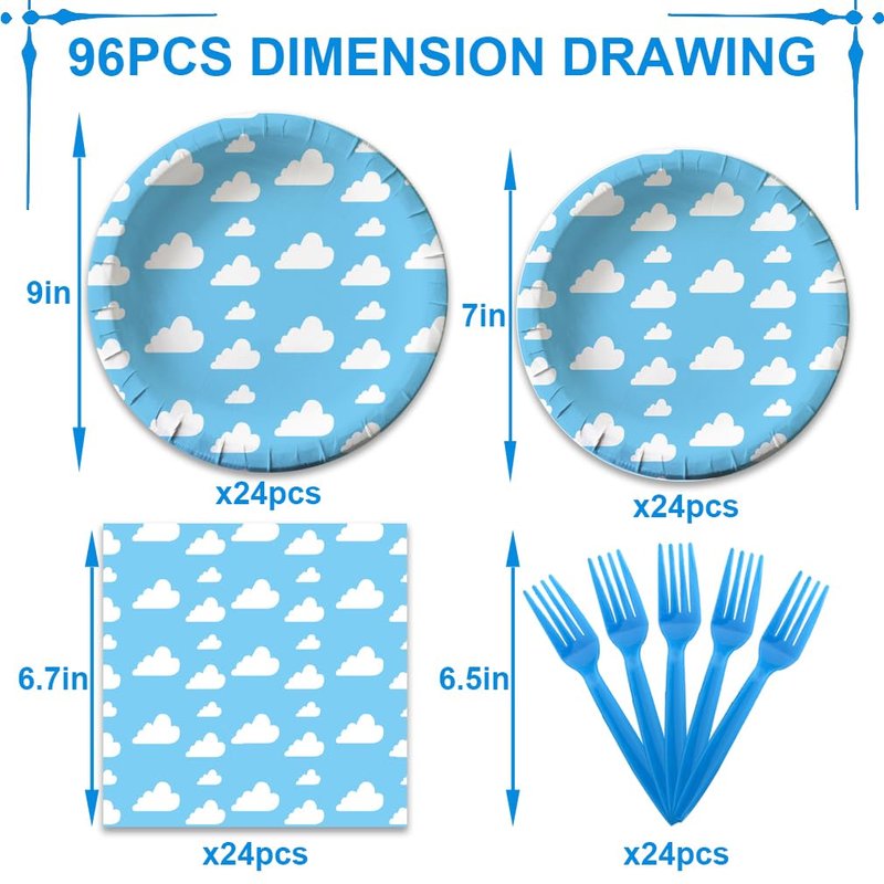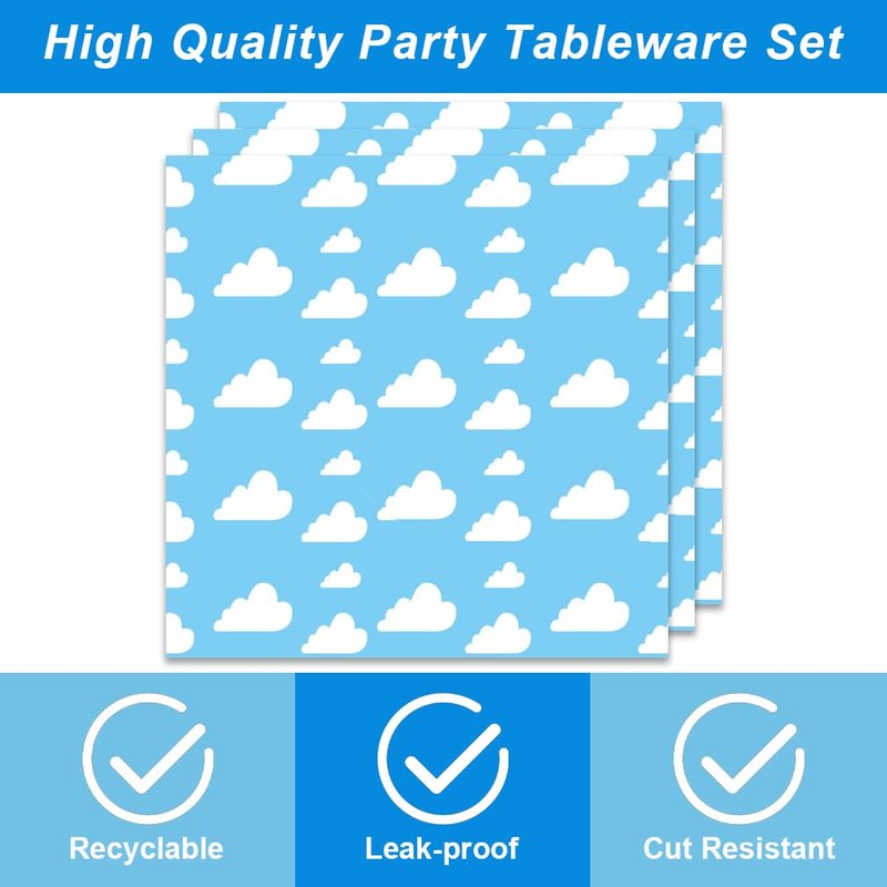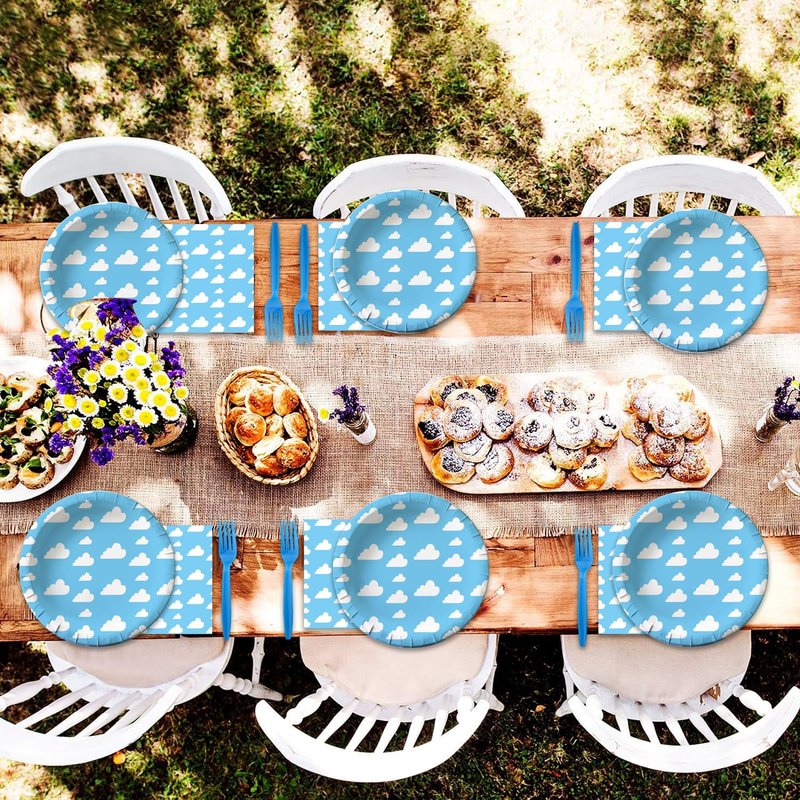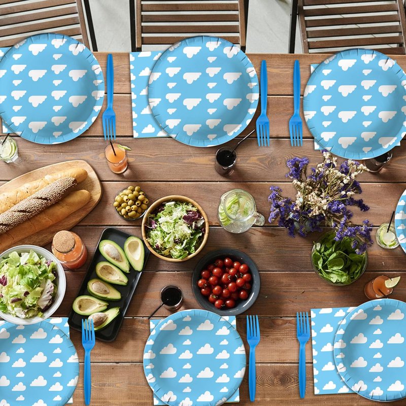 Our Cloud Party Supplies dinnerware set is 100% Food Grade and BPA-Free.Paper plates and paper napkins are made of biodegradable,recyclable,heavy duty paper,which won't folded, teared or broken easily, prefect for desserts, party food.