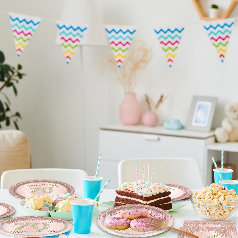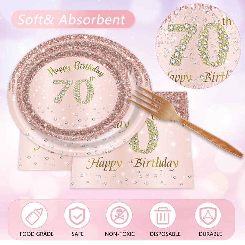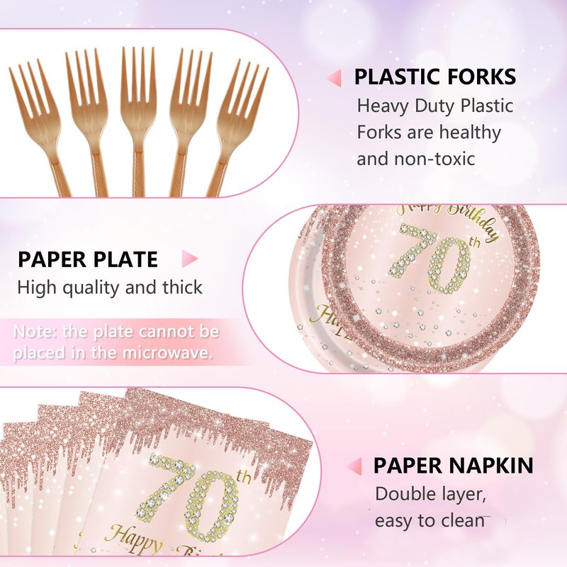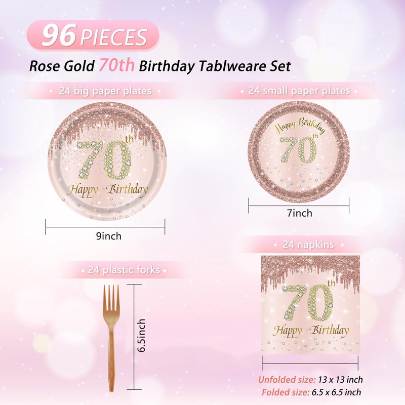 96PCS 70th Birthday Decorations for Women Rose Gold 70 Years Birthday Party Supplies Rose Gold Birthday Supplies Plates and Napkins Forks Disposable Tableware Set for Gifts Women1954 Themed Party