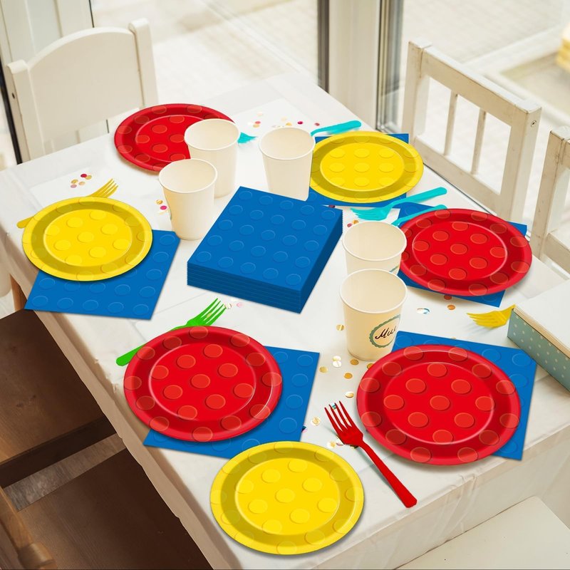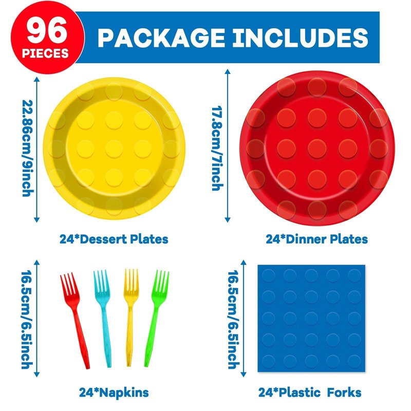 - What You Will Get: The package comes with 24 sets of building block tableware sets, including 24pcs 9inches plates, 24pcs 7inches plates and 24pcs napkins(About 6.5 x 6.5 inches folded, About 13 x 13 inches unfolded), and 24pcs forks in 4 colors(red, yellow, green and blue), totally 96pcs, each set serves for 24 guests. Sufficient quantities are enough for your party, picnic, indoor or outdoor activity.