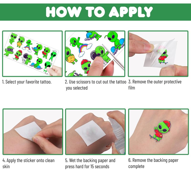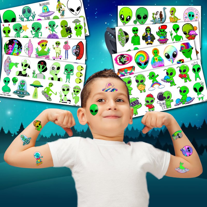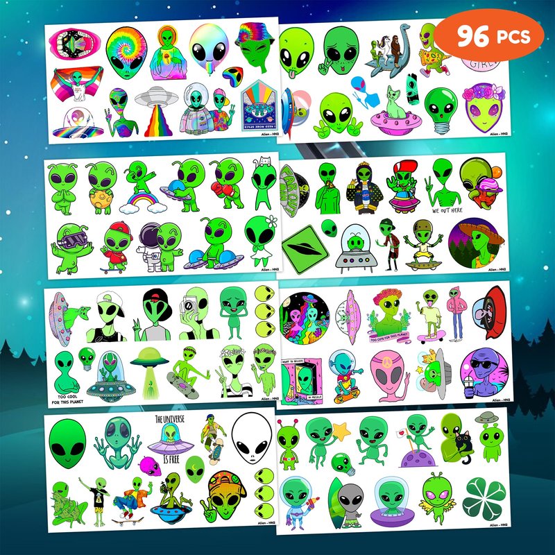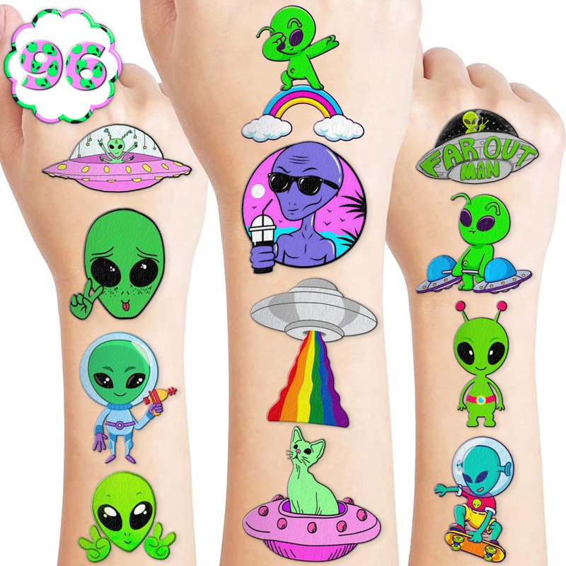 - Pattern rich: Alien Outer Space Galaxy Temporary Tattoos include 8 Sheets 96 PCS, the size of each sheet is 6.1 * 3.1 inches. Having a variety of characteristics, shapes and vibrant colors can stimulate your children's imaginations and bring a creative atmosphere to your Alien Theme Party.
