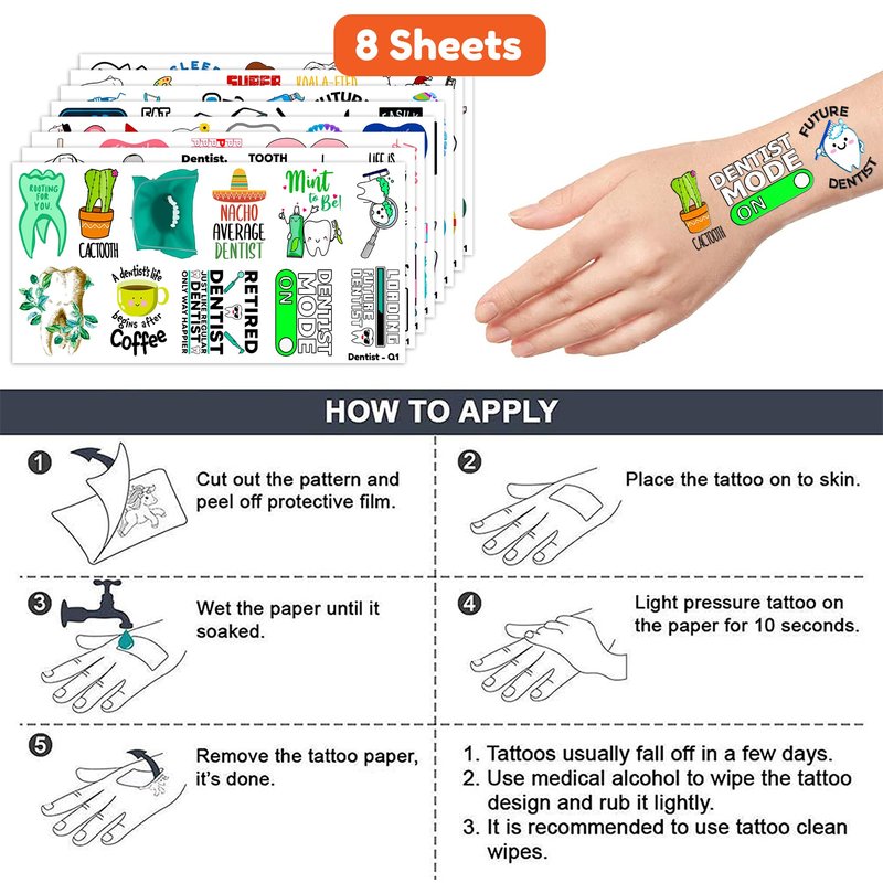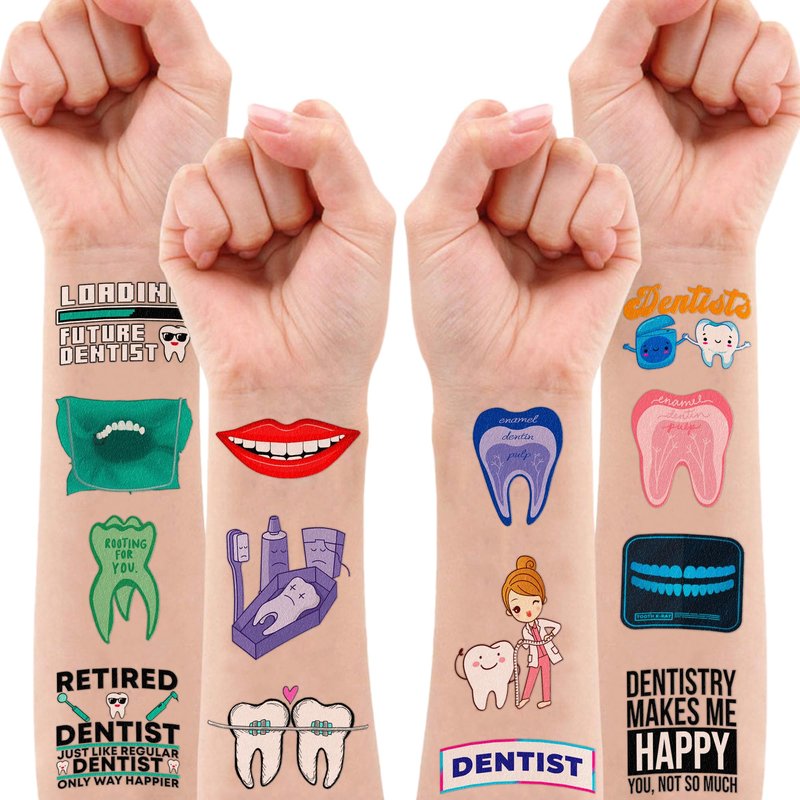 - Cute Future Dental Dentist Party Supplies: 8 sheets Future Dental Dentist First Milk Tooth theme temporary tattoos stickers, features an assortment of cute themed characters, each sheet measures 6.1 x 3.1 inch , all kinds of designs and colors will bring more fun to your party, one size fit all adult and kids.