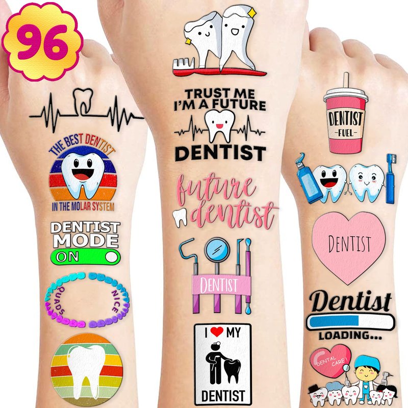 96PCS Cute Future Dental Dentist Temporary Tattoos Birthday Themed Party Supplies Decorations Favors First Milk Tooth Teeth Stickers Tattoo Gifts for Baby Kids Girls Boys Decor School Reward Christmas