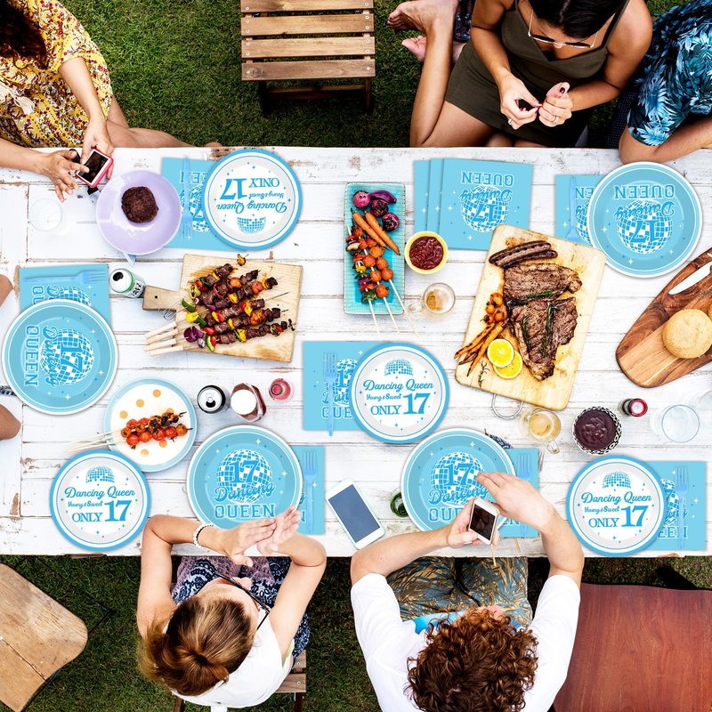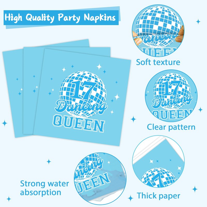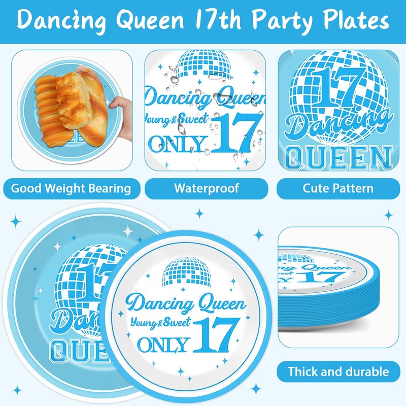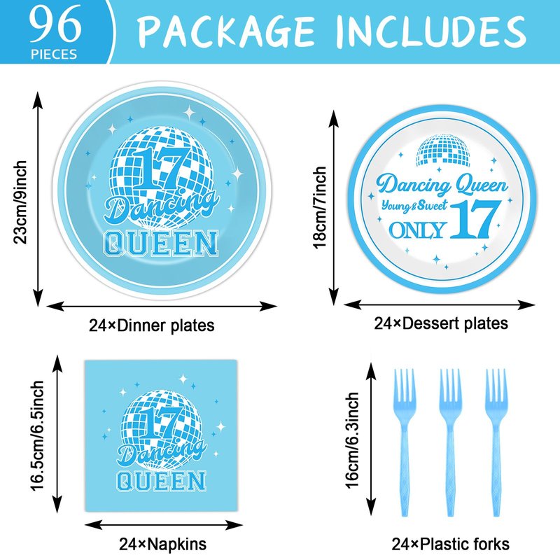 - Package includes: Celebrate in style with our dancing queen 17th birthday party supplies. This set includes 24pcs 9inch dancing queen party dinner plates, 24pcs 7inch disco dessert plates, 24pcs dance napkins, and 24pcs light blue forks in a glamorous blue and white design , ideal for your "Young & Sweet ONLY 17" celebration.