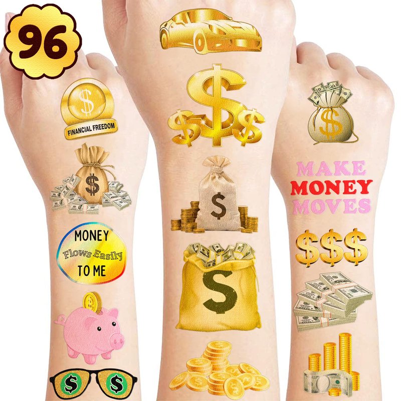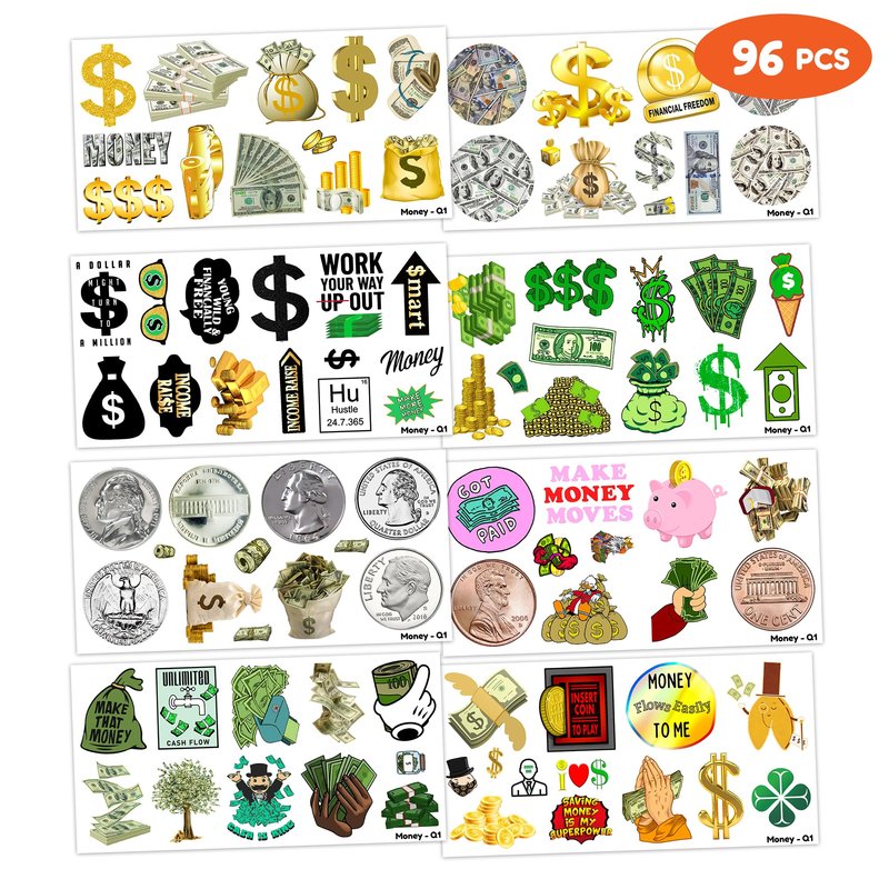 96PCS Fun Tattoo Temporary Tattoos Money Jar Symbol Stickers Theme Birthday Party Decorations Favors Decor Supplies Cute Quote Sticker Gifts for Adults Kids Girls Boys School Prizes Carnival Halloween