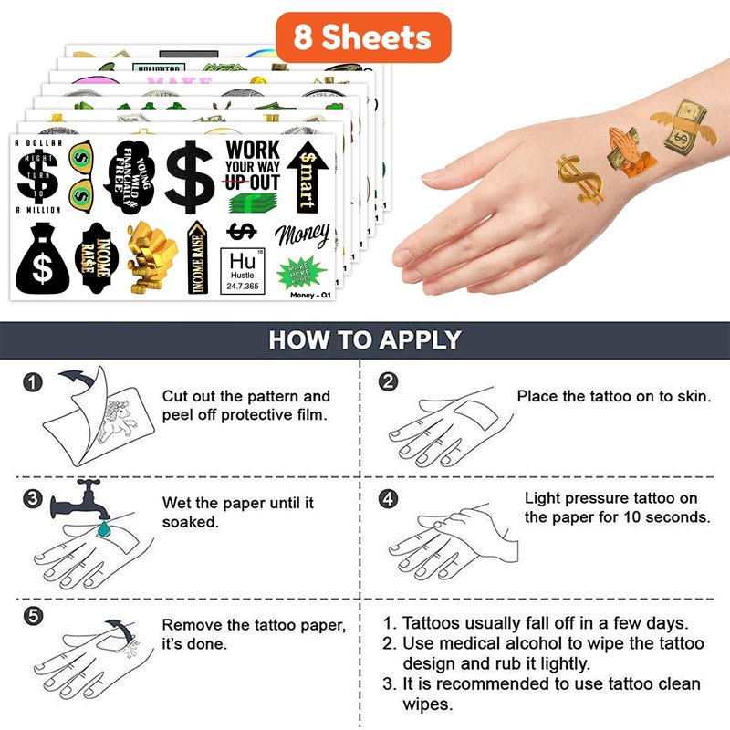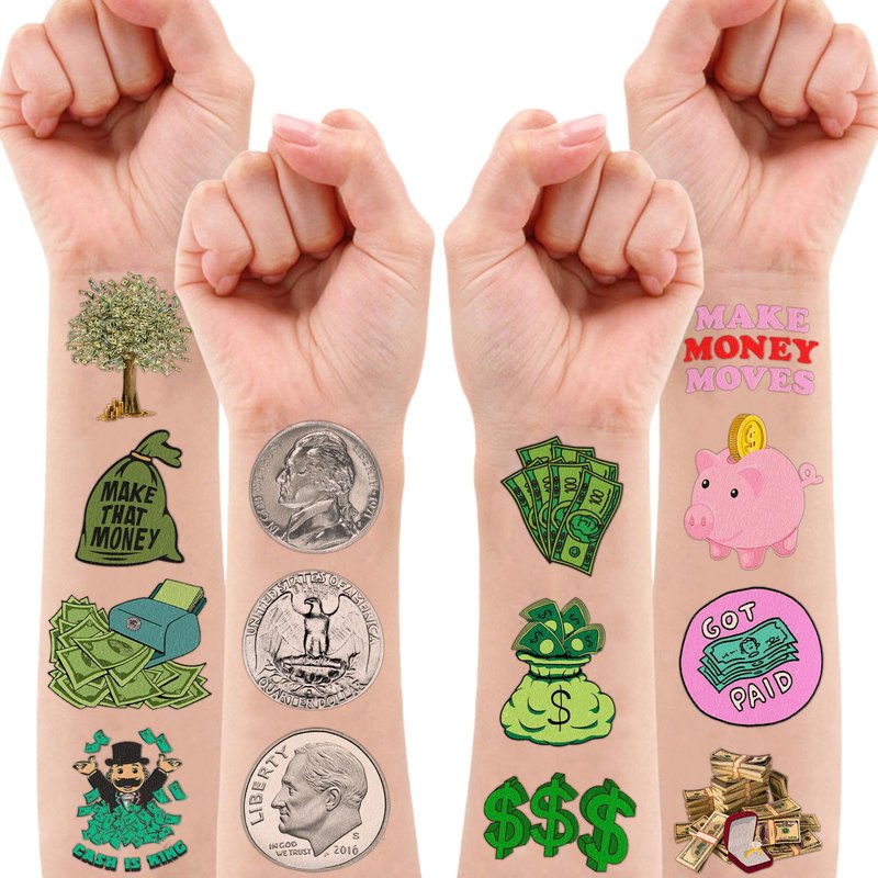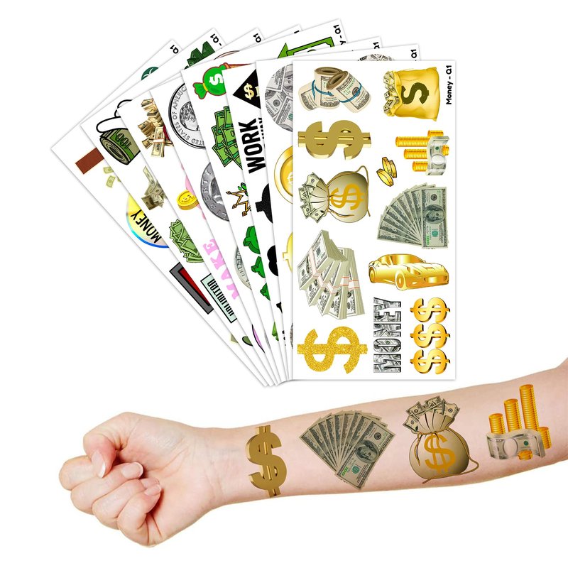Fun Money Jar Quote Collecting Birthday Party Supplies: 8 Sheets 96 PCS Fun Money Jar Quote temporary tattoos stickers, Have a variety of cartoon themed characters, Children can easily Fun Money Jar Quote stickers and take unique photos to make fond memories. The size of each sheet is 6.1 * 3.1 inches. Fun Money Jar Quote Collecting Birthday Party Decoration: The set contains instructions for use and is easy to use. Fun Money Jar Quote tattoo stickers can be applied on arms, face, hands, neck, shoulders, legs, wrists and ankles to make you look cool at all kinds of parties. Popular hit with your kids. You can apply them to your body or some smooth objects, for example, glass, stationery, paper, crafts cups, cabinet, bottle. Cute And Funny Fun Money Jar Quote Collecting Themed Tattoos: Fun Money Jar Quote Temporary tattoos Stickers, features an assortment of themed characters, colors are bright, and designs are adorable, use them as party favors and your kids will love. Perfect for themed party, birthday activities, school reward and other party events. They will be your kids' favorite small gifts. More Safety & Healthy Choice: These temporary tattoos are made of high quality safety and green paper, Non-allergenic and totally safe for your kid's skin. Simply wet the tattoo with water and stick transferred them onto your body, hands, faces and arm you like. Tattoos will last from 3 to 5 days ,it also can be easily removed with baby oil, makeup remover or rubbing alcohol. Not recommended for people with a history of sensitive skin, if symptoms appear, stop using immediately. How to Use: Cut out tattoo of choice and remove clear sheet. Place tattoo face down on skin. Wet the tattoo thoroughly with a sponge. After 20-30 seconds, gently remove the backing paper. Allow the tattoos to dry. Very easy to use.
