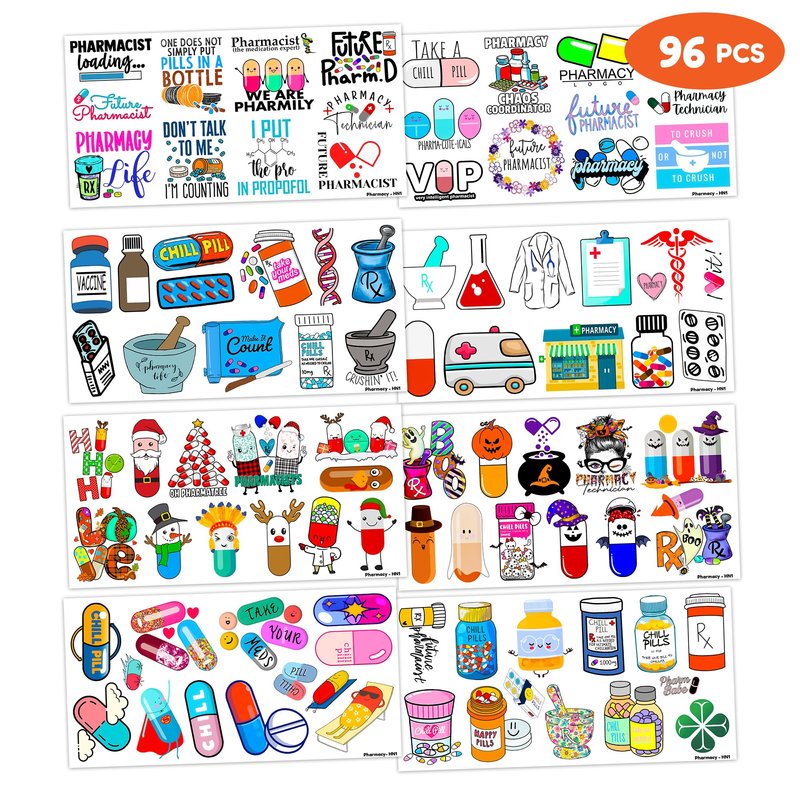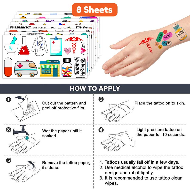 - Pattern rich: Funny Future Pharmacist Pharmacy Doctor Nurse Temporary Tattoos for Kids include 8 Sheets 96 PCS, the size of each sheet is 6.1 * 3.1 inches. Having a variety of characteristics, shapes and vibrant colors can stimulate your children's imaginations and bring a creative atmosphere to your Future Pharmacist Party.
