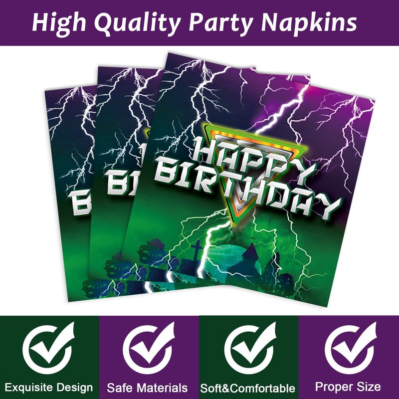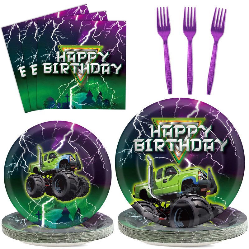 - Green purple monster truck theme: Our monster truck birthday plates and napkins use green and purple as the theme colors, with monster trucks, lightning patterns and printed with the words "HAPPY BIRTHDAY", the monster truck theme paper plate set will add fancy and cool touch to your party.