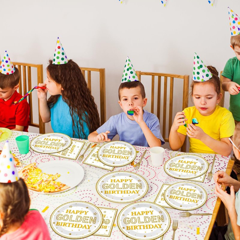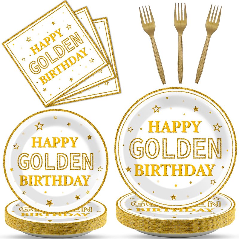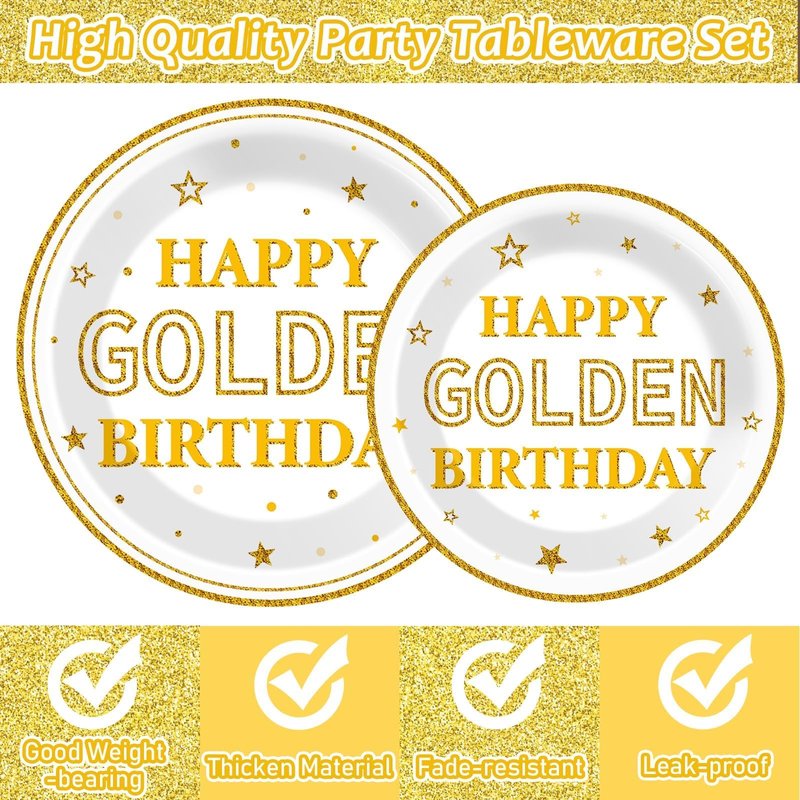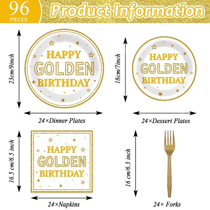 - Save your time: No wash up. Save your time on cleaning. You just need to throw this happy golden birthday tableware set into the trash can after the golden birthday party. You can spend more time playing with your friends and families.