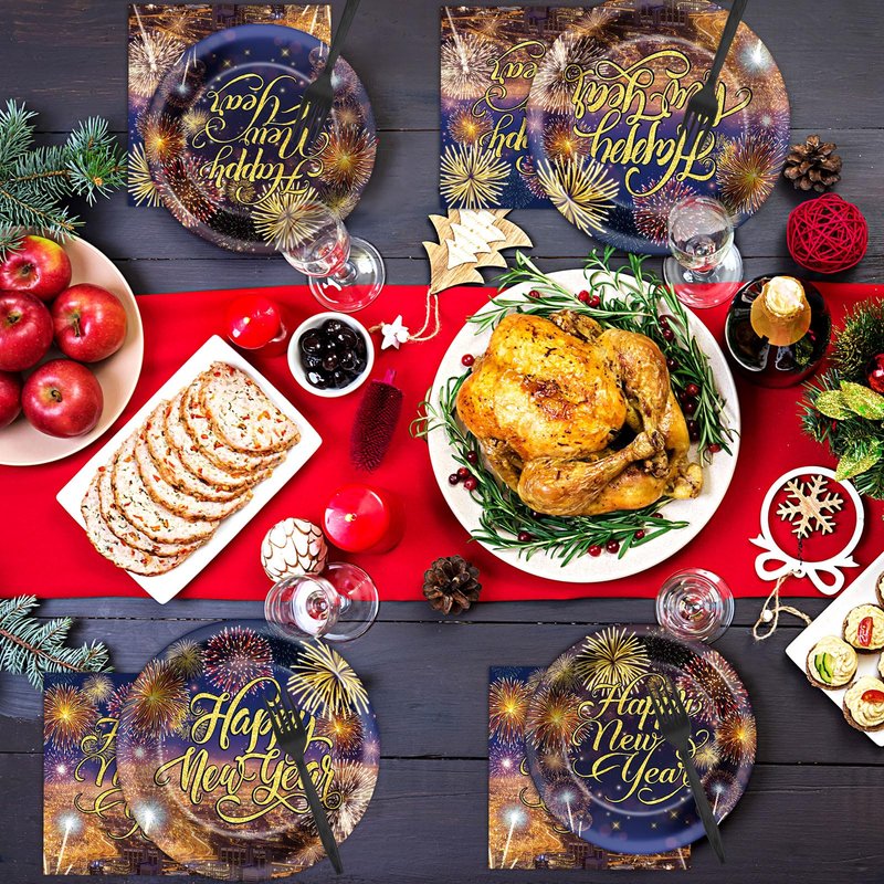 - New Year Fireworks Theme: The paper plates in this set of new year tableware feature a beautiful fireworks design.The gorgeous fireworks at night show the lively atmosphere of the coming New Year. This tableware set will bring you a perfect experience for the New Year party.