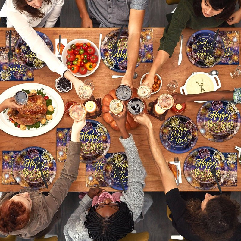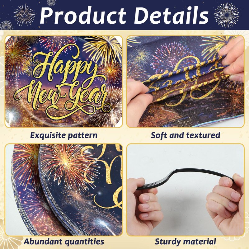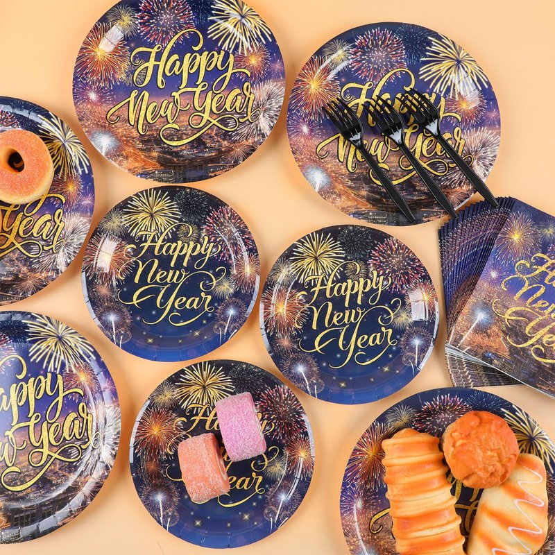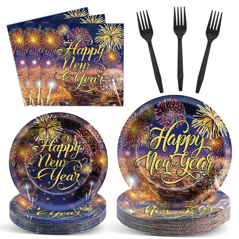 - Package Includes: The happy new year fireworks tableware sets include 48 paper plates with 2 size, 24 forks, and 24 napkins. The tableware set can serve 24 guest to enjoy a perfect meal.You can also store excess paper trays for future use, or give them as gifts to multiple family members or friends.