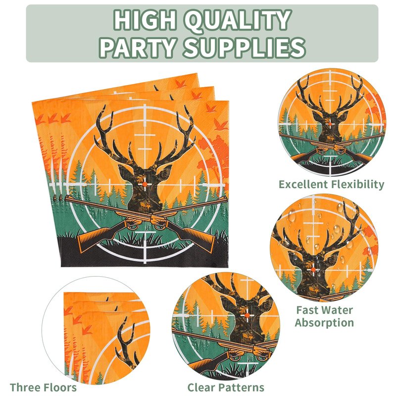 - 【Hunting Camo Design】Our hunting theme birthday decorations feature deer, including hunters, forest trees, guns and other hunting scene elements, with a cool camo design on one circle of the plate, providing an immersive outdoor hunting experience for your gathering and letting you enjoy the hunting spirit. They are perfect for outdoor sports lovers and hunting enthusiasts to add adventure to your party!