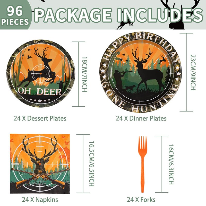 - 【Hunting Party Set】Elevate your celebration with our hunting camo party supplies! This 96-piece hunting-themed birthday tableware set includes everything you need for a party of 24 guests - 24 9-inch camo plates, 24 7-inch camo plates, 24 napkins, and 24 forks. Get ready to throw a crazy birthday party!