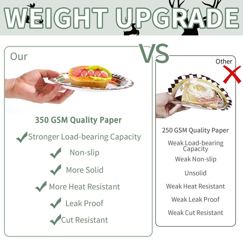 - 【Upgraded Material】Each camo plate is thickened to 350g, solid and durable, not easy to bend. Each napkin is made of 3-ply, soft and absorbent, not easy to tear. Each fork is made of high quality plastic, not easy to break. Hunting themed patterns and colors are beautifully printed and not easy to fade. Upgraded quality materials can withstand the severe test of outdoor adventures and make your party and gathering smooth sailing! (Tip: Please do not microwave the plates.)