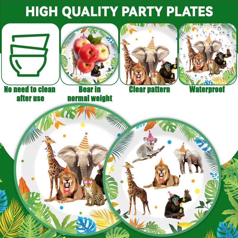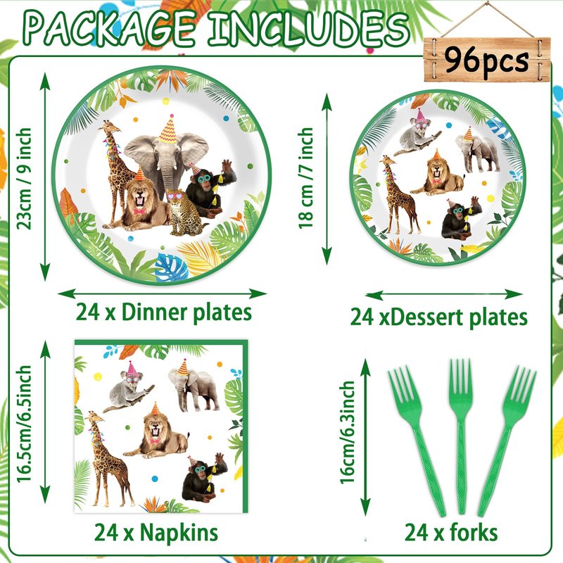 - Package includes: You'll get 24 pieces of jungle animals party paper dinner plates of 9in, 24 pieces safari themed birthday party dessert plates of 7in, 24 pieces of jungle party napkins 6.5in, and 24 pieces of plastic green forks for each set that can serve 24 guests.