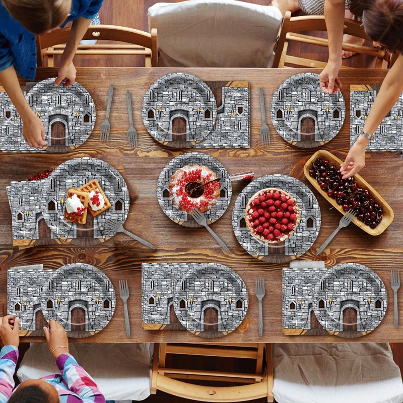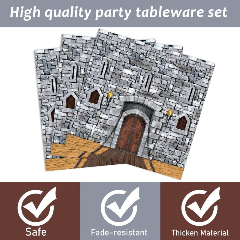 - Exquisite design: The medieval scene castle tableware set features an authentic medieval castle scene with tall city walls, city gates, and a drawbridge pattern. The rustic stone wall design brings a retro, medieval atmosphere to any party, enhancing the medieval party decor.