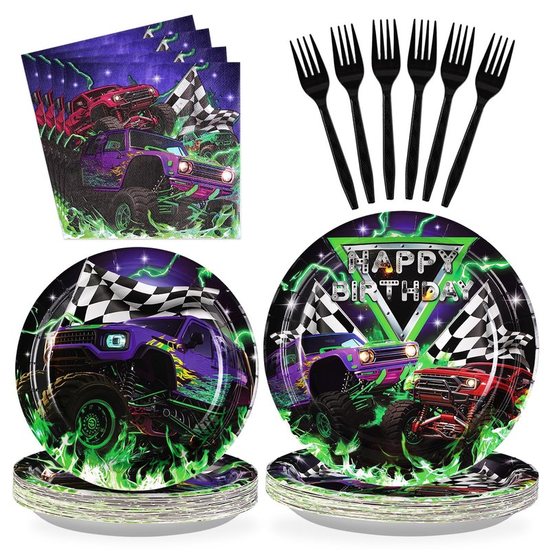 - Monster Truck Party Decorations: Our monster truck disposable tableware includes 24 * 9'' monster truck paper plates, 24 * 7'' monster truck plates, 24 * 6.5'' paper napkins, and 24 plastic forks. Our monster truck birthday party plates are suitable for kids and boys birthday party