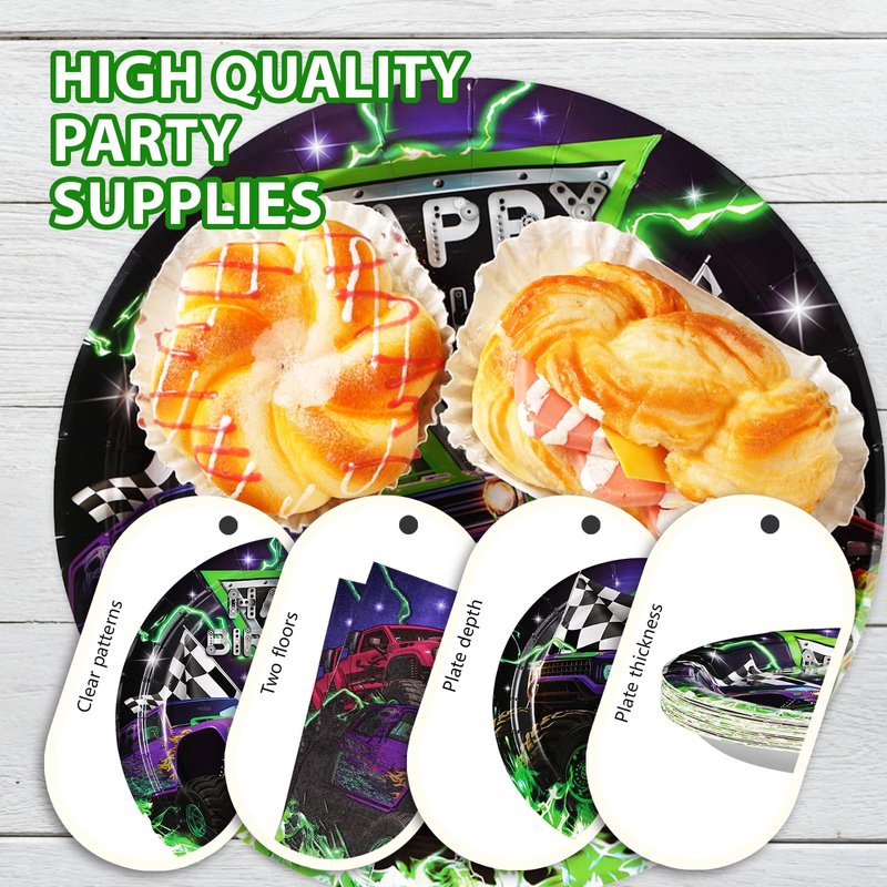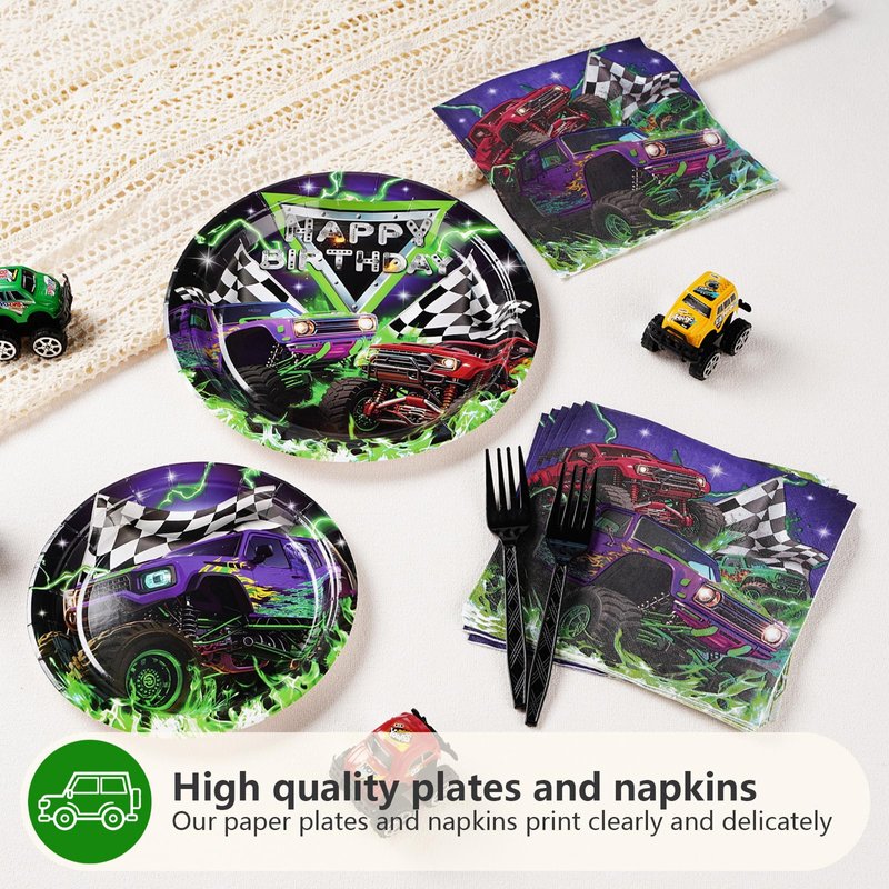 - Premium Material: The monster truck disposable plates are made of heavy duty paper. Green and purple monster truck party plates are designed to be strong enough to hold a full plate of food without folding and tearing. Napkins are soft and absorbent. Napkins are thick to ensure durability (Tips:Please do not microwave these products)