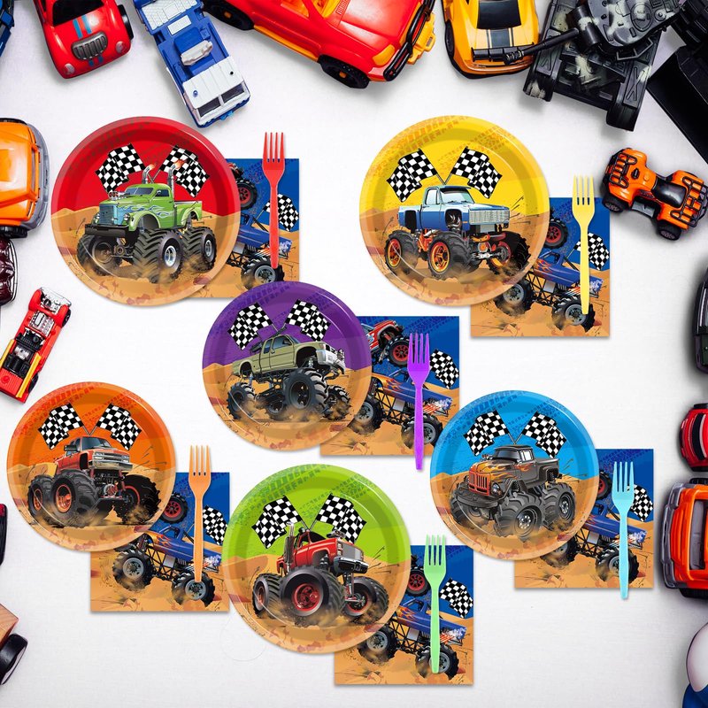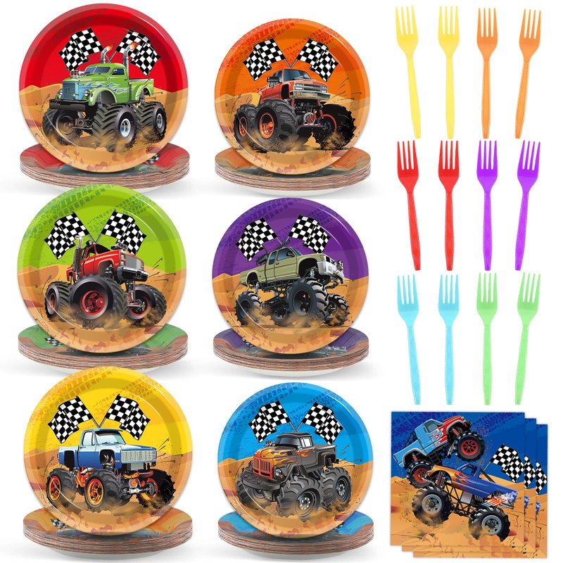 - 1.Package Includes:You will receive 24 9-inch Monster Truck Birthday Party paper plates ,24 7-inch Monster Truck Birthday Party paper plates , 24 Monster Truck Birthday Party paper Napkins with 24 Count 6 different Color forks, classic elements paired with bright colors will create a truck-themed atmosphere for your birthday party.