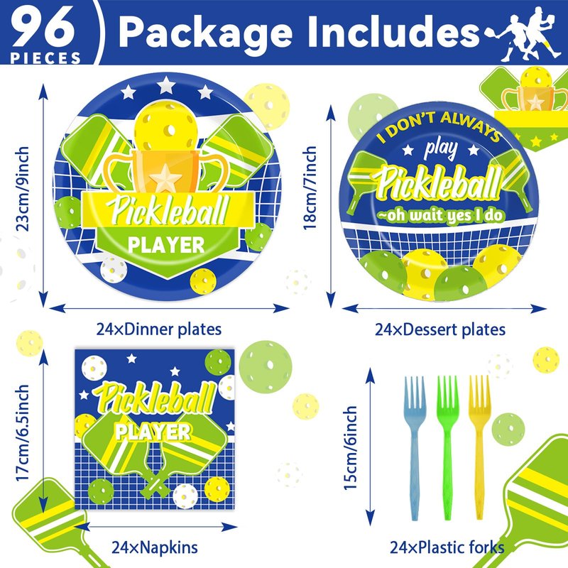 - 【Package Includes】You will receive 24 pieces of Pickleball plates of 9’’, 24 pieces of Pickleball Players Sport themed Birthday paper plates of 7’’,24 pieces of Pickleball napkins of 6.5’’, and 24 plastic Blue、Green、Yellow forks that can serve 24 guests.