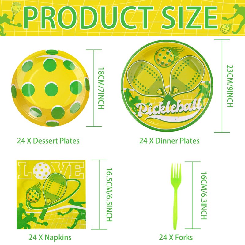 - 【Pickleball Party Supplies】Thesepickle ball birthday party supplies tableware included 24pcs 9'' pickleball plates, 24pcs 7'' pickleball paper plates, 24pcs paper napkins, 24pcs disposable forks, providing a dependable surface for serving delicious snacks and treats.
