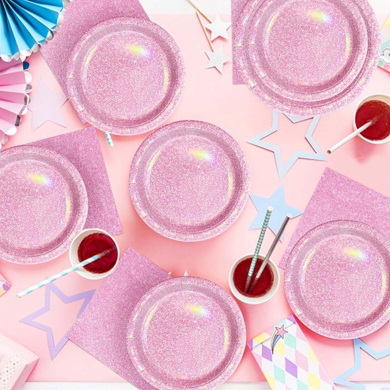 - 【Pink Rainbow Holographic Design】Our pastel rainbow plates and napkins are styled with a combination of pink and white dots, it's worth mentioning that we've done a holographic rainbow laser coating design, which will show a rainbow of rays in the light, making the surface of the boards even more dazzling, and the glamorous pastel glitter design will create a dreamy ambiance for your party, they will be very popular with people