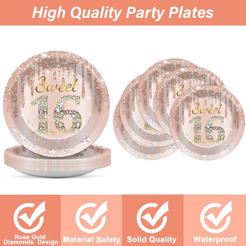 - High-Quality Material:We chose stronger plates and softer napkins than others.Sixteenth birthday party plates and napkins are made of from high quality paper and are safe for both children and adults.Using rose gold 16th birthday party decorations will make your party more enjoyable.