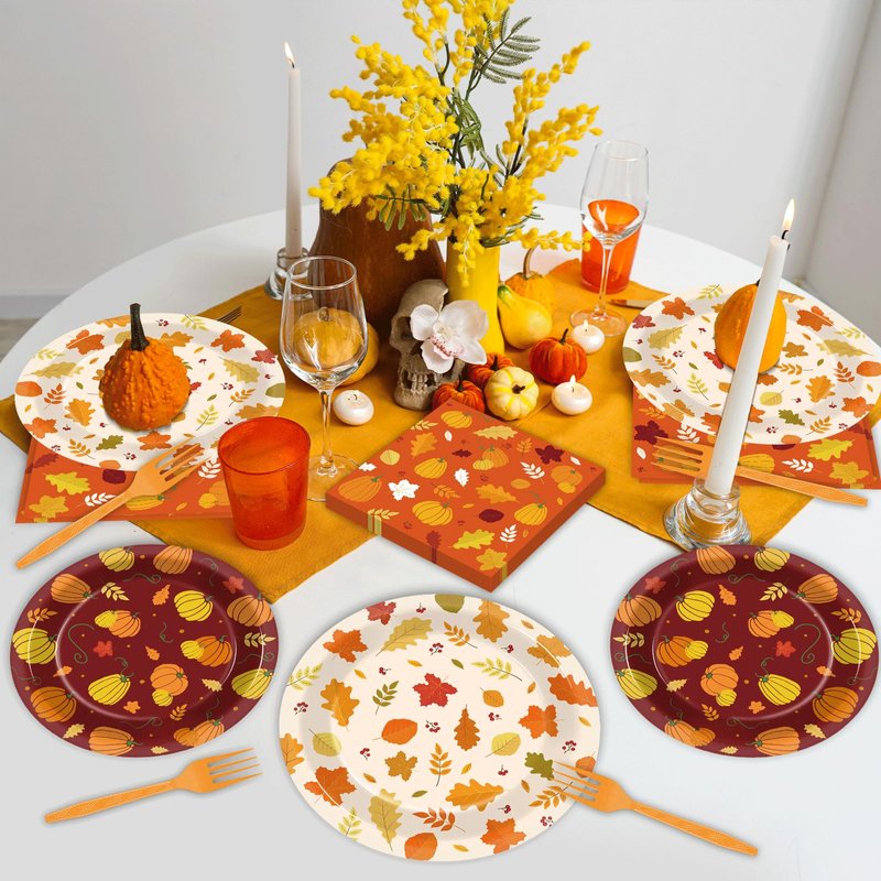 Our fall party dinnerware set includes paper plates and napkins adorned with beautiful fall leaves and pumpkins. The vibrant designs capture the essence of the season, making your Thanksgiving table both festive and inviting.