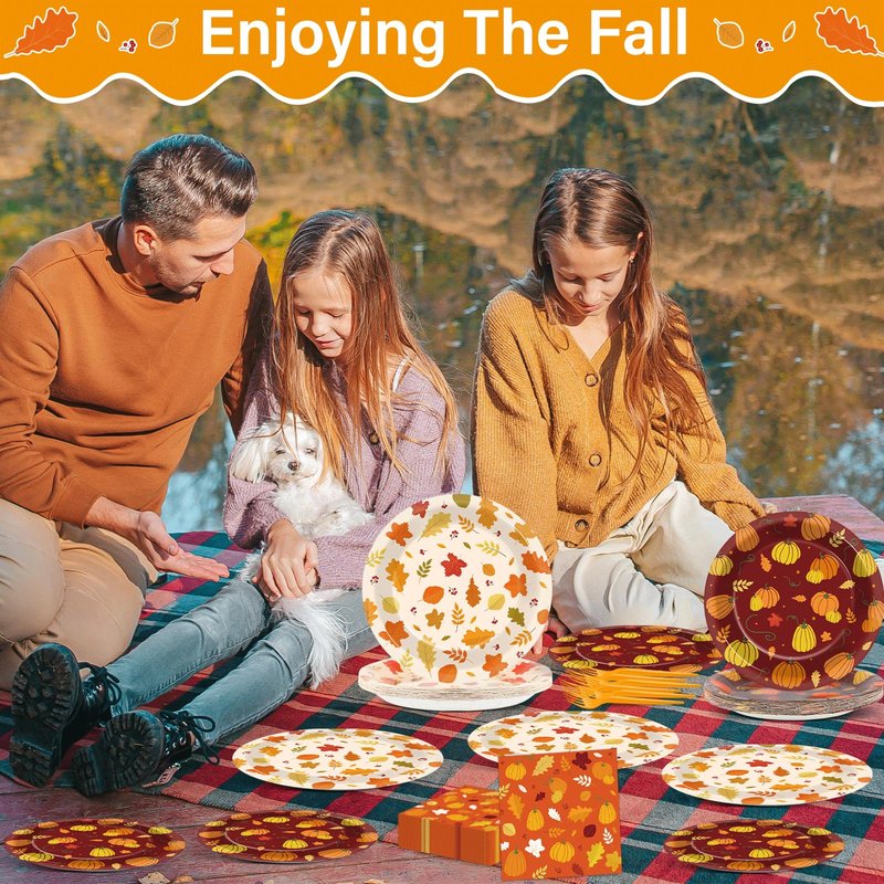 - Fall party theme: This Thanksgiving tableware set party supplies showcase classic fall designs with a warm color palette of beige, brown, and orange, featuring charming maple leaves and pumpkin patterns. It’s a ideal addition to your Thanksgiving dinnerware or harvest party favors, adding a seasonal touch to your celebrations.