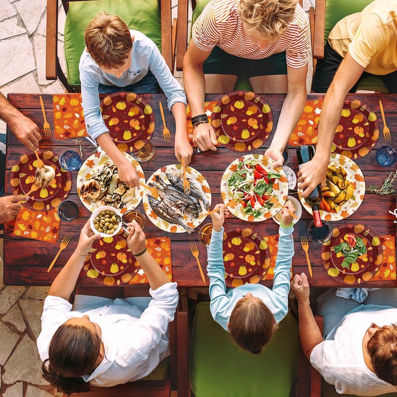 Made from durable, high-strength paper, our fall disposable plates are sturdy enough to hold your favorite holiday dishes without bending or breaking. The napkins are soft and absorbent, ensuring that your guests have a comfortable dining experience.