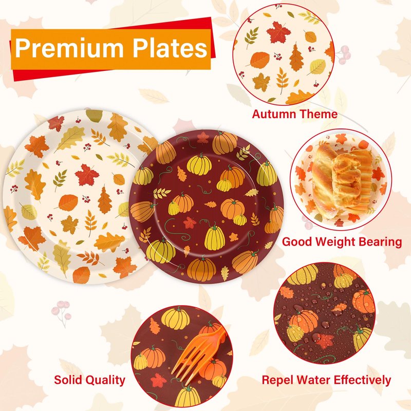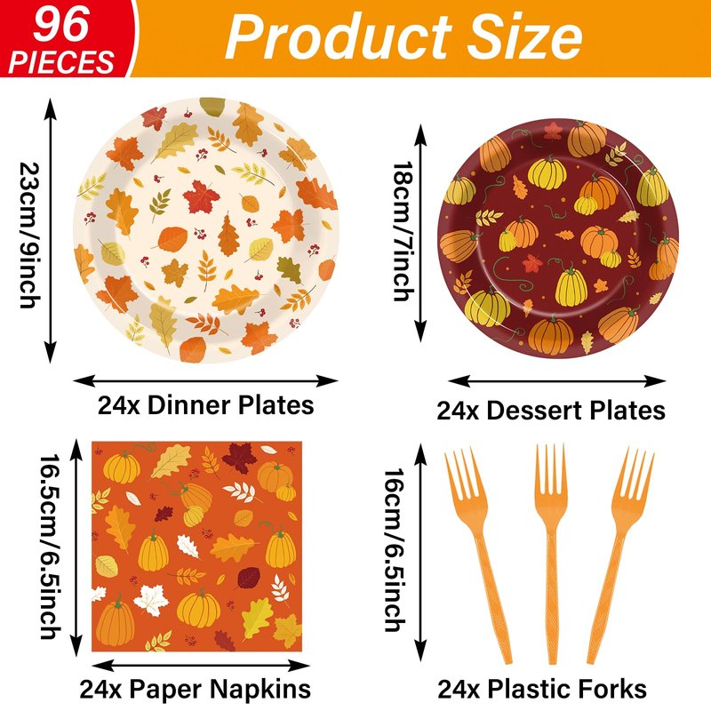 - Package includes: You'll get 24 pieces of 9in fall party paper dinner plates, 24 pieces of 7in Thanksgiving party dessert plates, 24 pieces of autumn party napkins of 6.5in, and 24 pieces of plastic forks for each set that can serve 24 guests, creating a visually stunning table decor for your party.