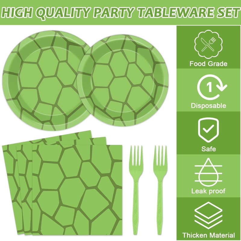 - Premium Material: This turtle green tableware set is made of Special density paper, no smell and well-printed, uneasy to break or fade, can hold up well with any kinds of food. You can use these party plates cups and napkins sets with confidence.