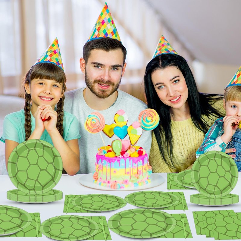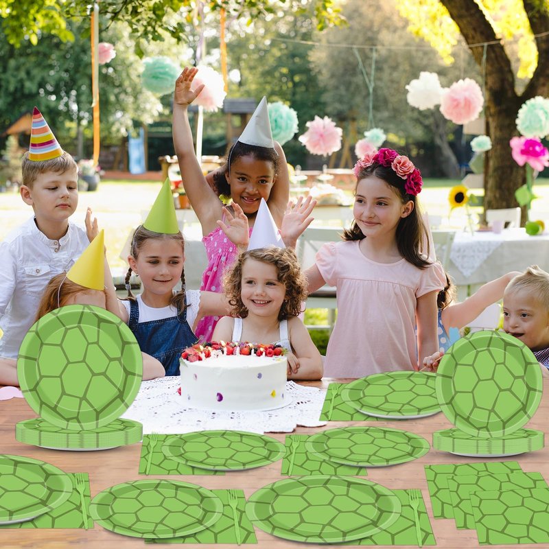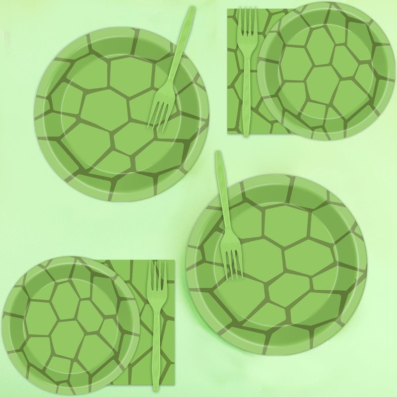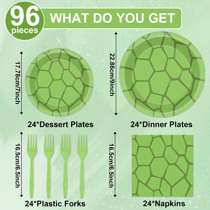 - Package Include: You will get 24 pcs 9in turtle party paper plates, 24 pcs 7in green dessert plates, 24 pcs 6.5 in turtle green party napkins and 24 pcs green forks, enough quantity to serve 24 guests.