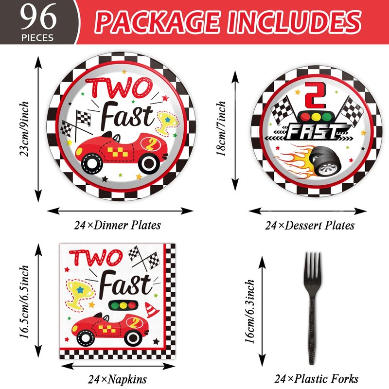 - 【Serves 24 Guests】Race car 2nd birthday party supplies Included: 24pcs 9" dinner plates, 24pcs 7" dessert plates, 24pcs paper napkins, 24pcs forks that can serve 24 guests, enough quantity for a different and unique party!