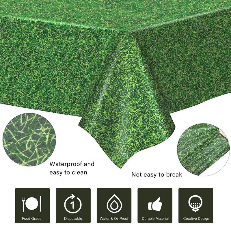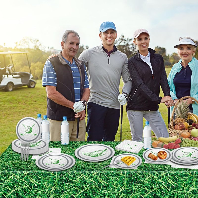 - Safe & Quality Materials: Golf themed plates and napkins are made of high quality paper, not easy to tear and break. Disposable forks are made of high quality plastic, the right size for easy use. Green Grass Tablecloth need to dissipate the smell before use
