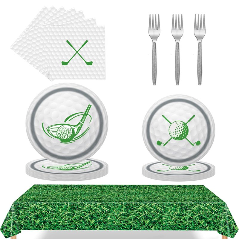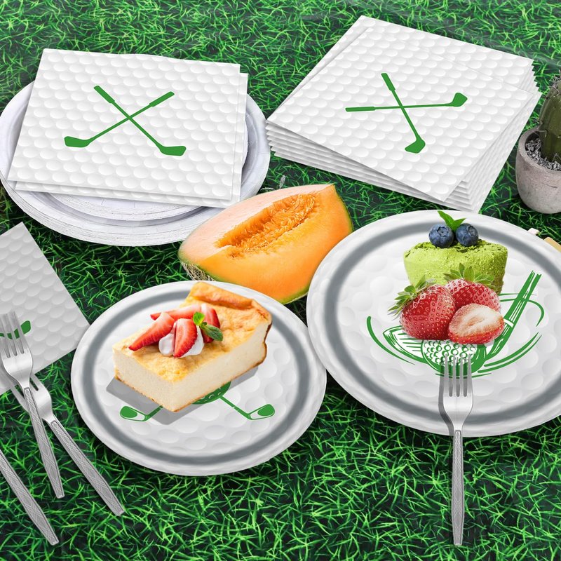 - Serve 24 Guests: This golf birthday party set comes with everything you need for 24 guests, including 24pcs 9'' dinner plates, 24pcs 7'' dessert plates, 24pcs golf paper napkins , 24pcs plastic forks and 1 disposable tablecloth