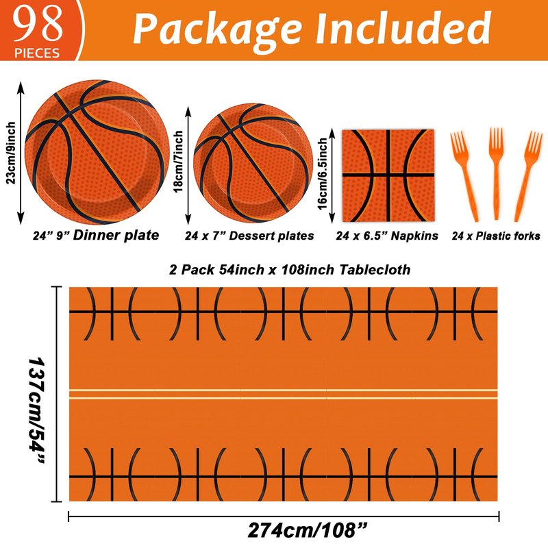 - Package included: Total 98pcs will get! You will receive 2 pack basketball plastic tablecloths, 24 9" basketball paper dinner plates, 24 7" basketball paper dessert plates, 24 6.5" basketball napkins and 24 pieces plastic forks, each set can serve 24 guests.