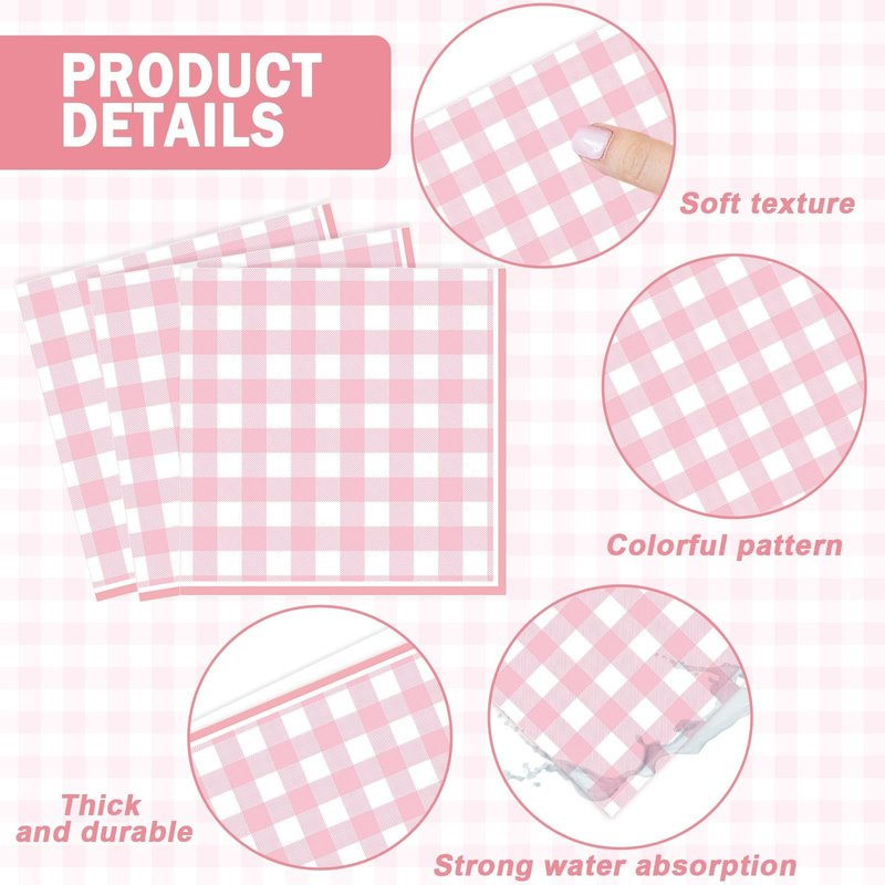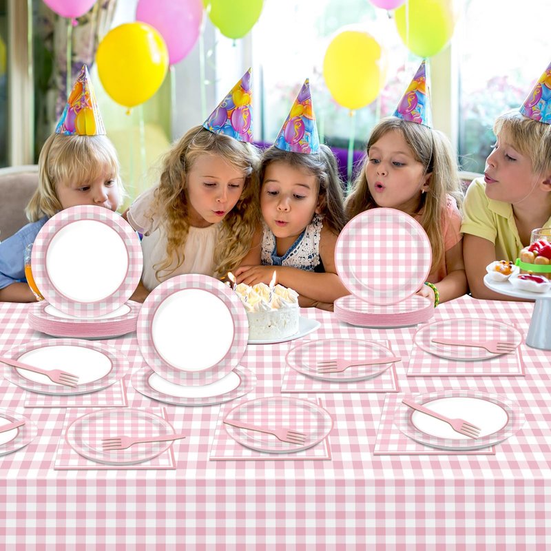 - Save time: No wash up. Save your time on cleaning. You just need to throw this pink and white gingham checkered plaid tableware tablecloth into the trash can after the pink gingham party, could spend more time playing with your kids and friends.