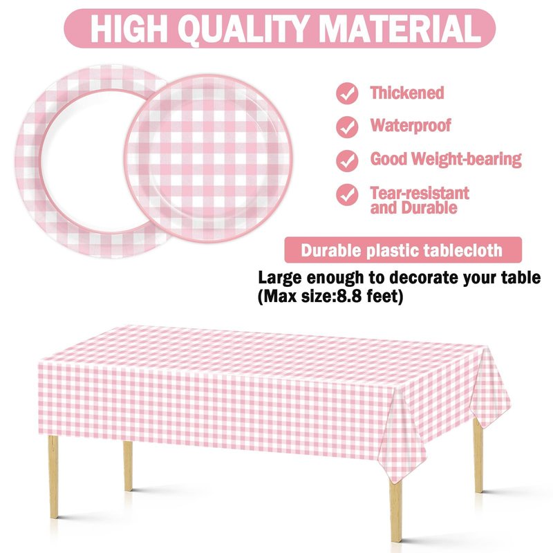 - Premium quality: These pink plaid picnic plates for girls are made of quality paper and well-printed, which is durable and reliable to use. This pink gingham table cover is made of plastic, waterproof and splash-proof, not easy to wrinkle, you can feel its smooth.