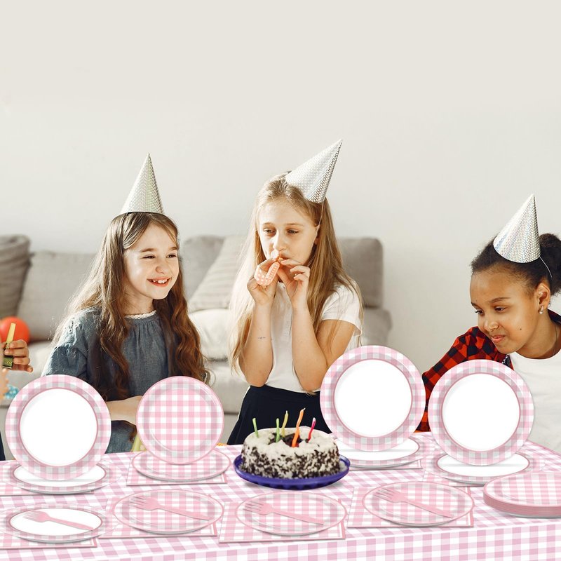 - Pink and white plaid design: Featuring a pink and white gingham checkered design, our pink gingham party supplies add a touch of elegance to any occasion. Create a appealing table decor with these pink plaid paper plates for picnic barbecue are ideal for adding a pop of color to your next event.