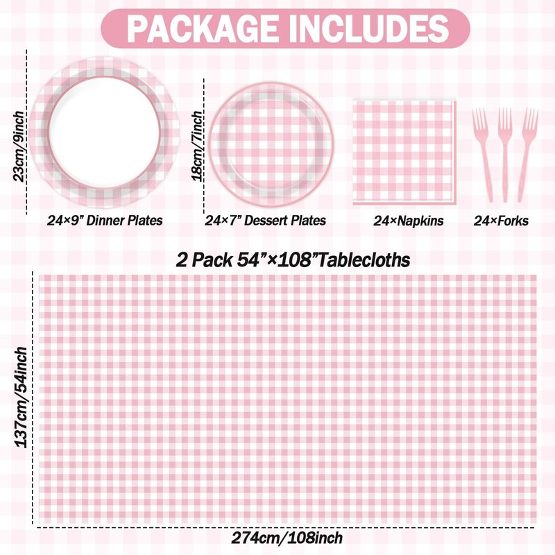 - Package included: You will receive 2 pack 9 x 4.5ft pink plaid theme tablecloth, 24pcs 9 inch camp gingham paper dinner plates, 24pcs 7 inch gingham checkered dessert plates, 24pcs 6.5 inch pink and white plaid napkins and 24pcs pink forks, each set can serve 24 guests.