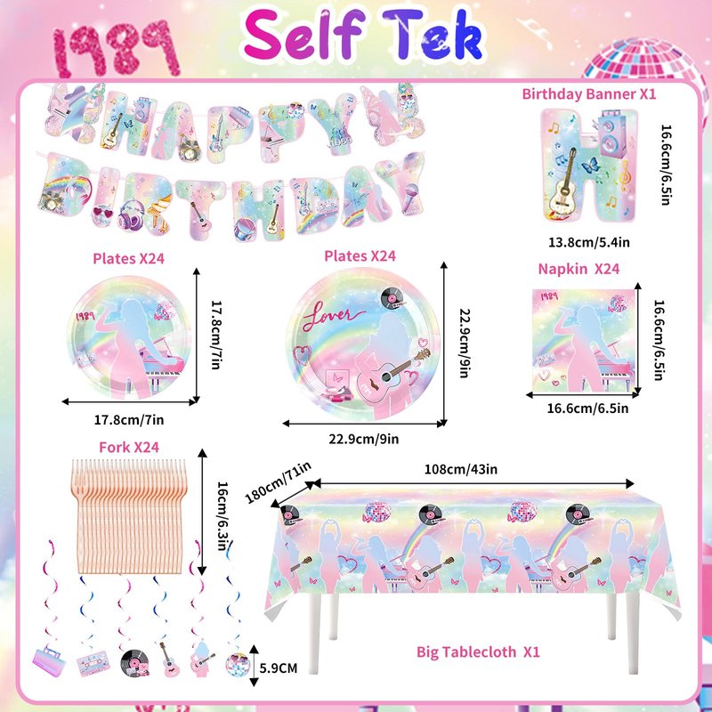 - Set includes: The birthday party decoration set includes 1 pcs Happy birthday banner,1pc tablecloth, 6 pcs hanging swirls, 24 pcs party dessert plates 7 inches, 24 pcs party plates 9 inches, 24 pcs napkins , 24 pcs forks, each set can serve 24 guests