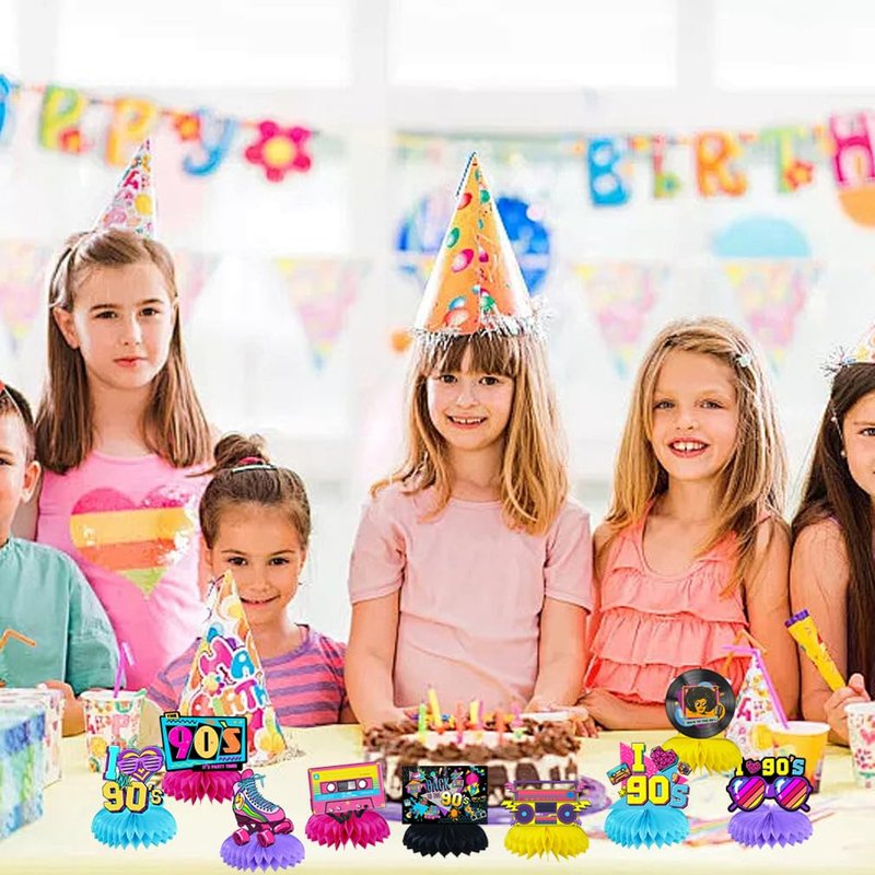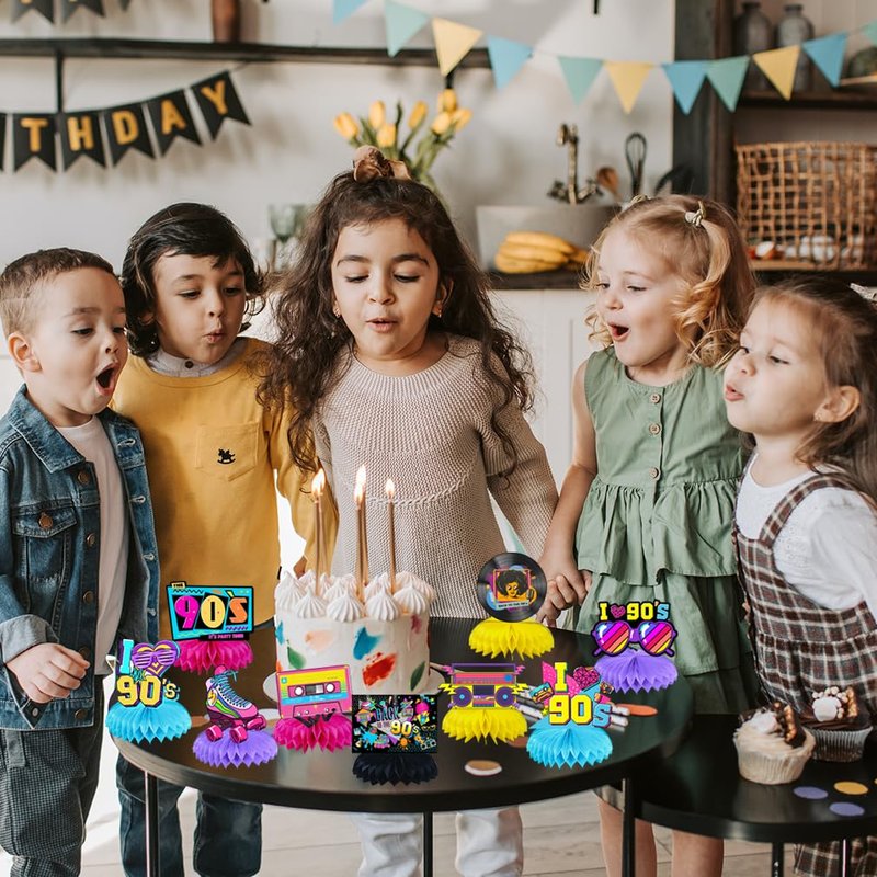 - 90S honeycomb centerpieces professionally printed on heavy-duty card-stock paper with unbeatable good-looking cartoon characterskit are prefect decoration for variety occasion, such as Inspired themed birthday party decorations,baby room decoration,fans party...