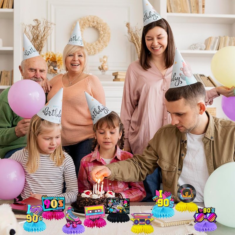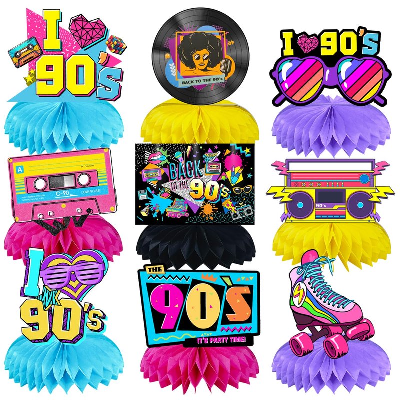 9Pcs 90S Birthday Party supplies set Honeycomb Centerpieces Double Sided Table Topper for 90'S Birthday Party Decorations (90S)