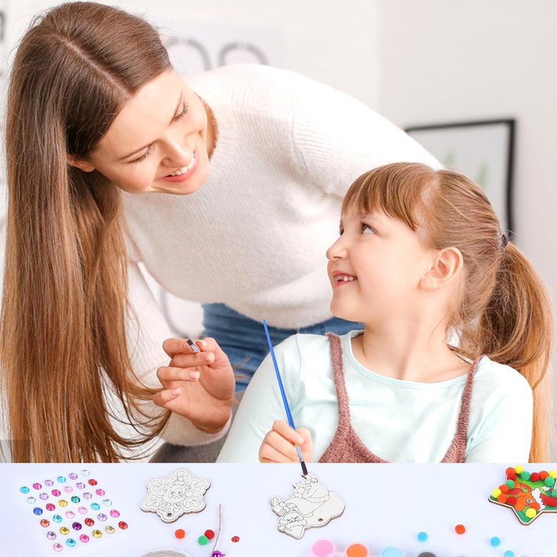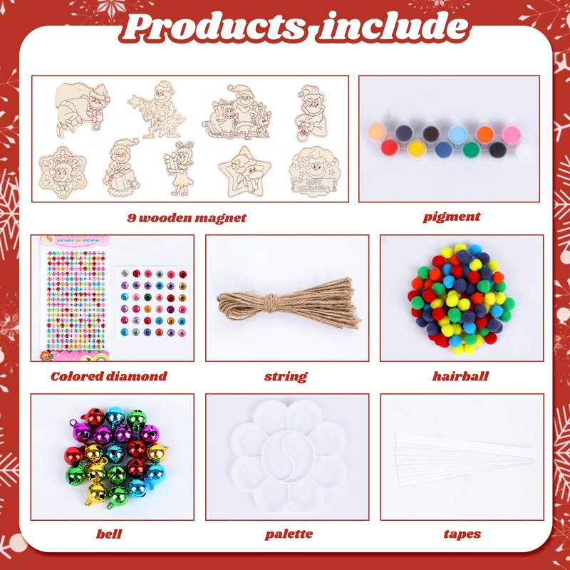 CUTE CHRISTMAS PATTERN DESIGNS: Our 9 pieces DIY wooden Christmas tree hanging decorations have unique and lovely patterns, such as Christmas tree, wreath, dog, gift box, Christmas thief, etc., creating a strong holiday sentiment and giving your christmas decorations a warm holiday glow. COMPLETE DIY ACCESSORIES:We provide complete DIY craft kits, including paint, colored diamonds, rope, fur balls, bells, palettes and tape, etc., and come with complete instructions, so you can easily make personalized christmas decor, enjoy the fun of DIY. QUALITY WOOD: The christmas ornaments wall hanging is made of premium wood with excellent texture, each wood piece is perforated for easy hanging and durable, a great holiday gift for long-lasting storage. HOLIDAY THEME, PERFECT VERSATILITY: These s Painting Kit can be hung on the Christmas tree, windows, door knobs, and even fireplaces, instantly adding the warmth and joy of Christmas to any corner. PERFECT GIFT CHOICE: Whether it's for friends or family, the DIY wood slice painting wall hanging is a gift full of festive emotions, which is both practical and conveys festive blessings and thoughts.