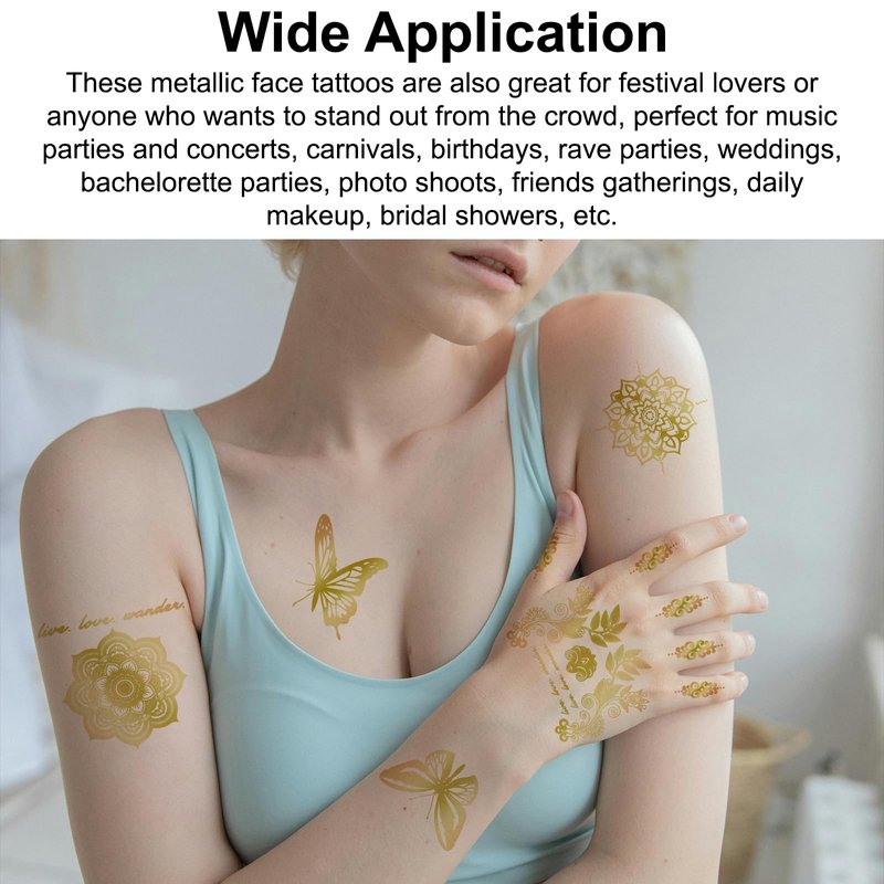 - Wide Applications: Our gold temporary tattoos are suitable for women, teenagers and girls of most ages. They can be worn on your face, hands, legs or anywhere you like, and are very suitable for music parties, carnivals, rave parties, weddings and other occasions. Wearing our tattoo stickers will make you shine and become the focus of the party.