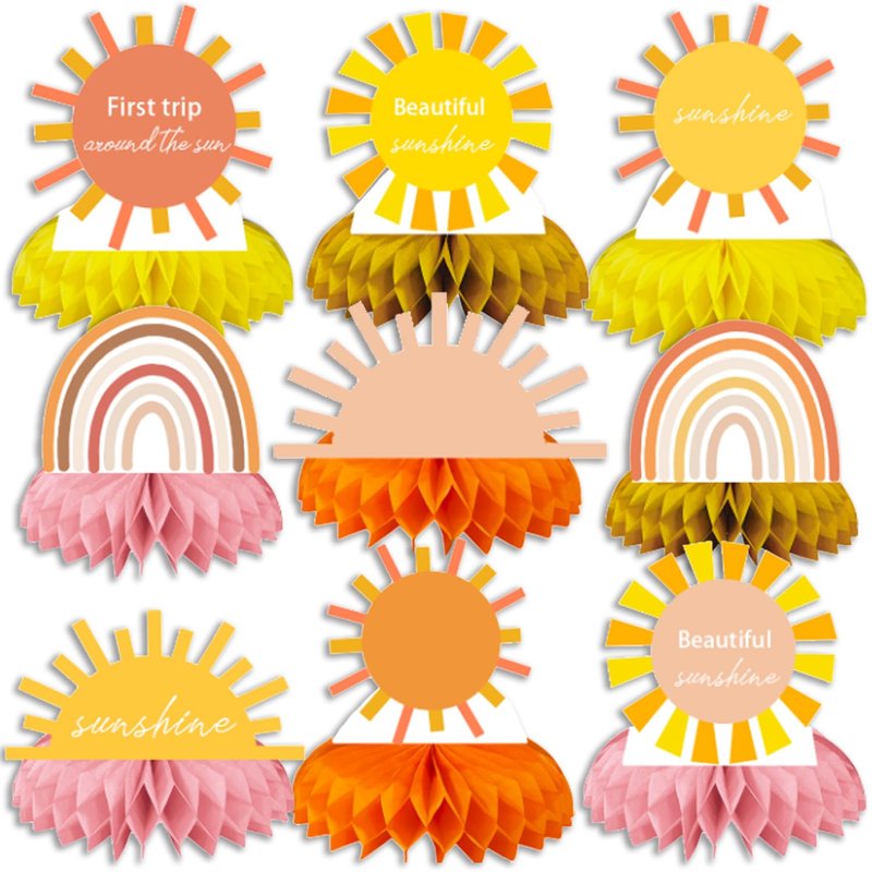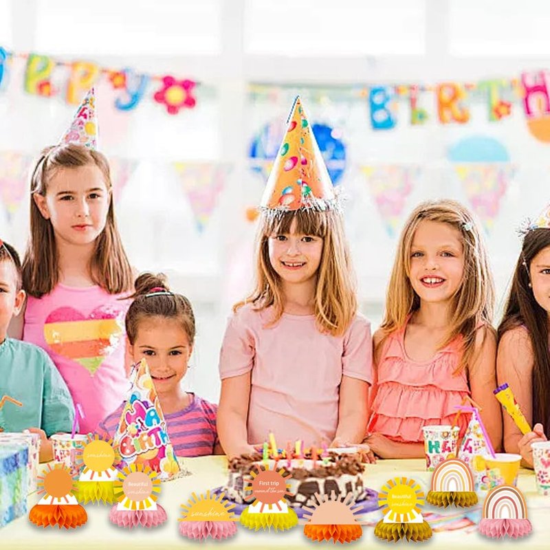 9PCS Groovy Hippie Boho Birthday Party supplies set Honeycomb Centerpieces Double Sided Table Topper for Boho Rainbow Birthday Party Decorations (Boho)