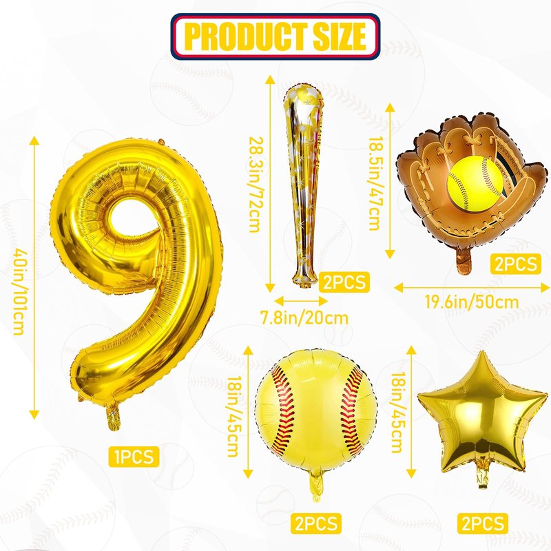 - Package Included: 2PCS softball foil balloons, 2 pcs jumbo glove balloons, 2pcs softball bat Balloons, 2pcs18’’ gold star balloons, 1pc 40 inch gold number balloon.Totally 9PCS. Perfect for a softball theme party.