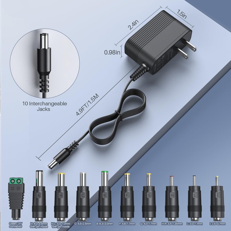- 【10 Interchangeable DC Jacks】 Selected 10pcs various connectors which can be used for most of your 9V 1A DC electronics, DC 9V power cord with 10 pcs DC jack dimensions with pin inside.⚠️Please DOUBLE CONFIRM the DC jack dimensions to ensure the compatibility of your devices