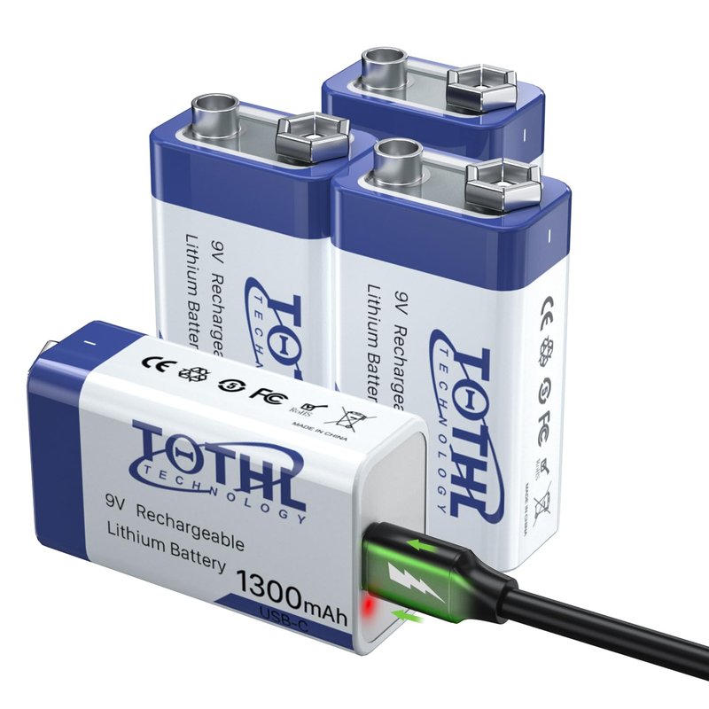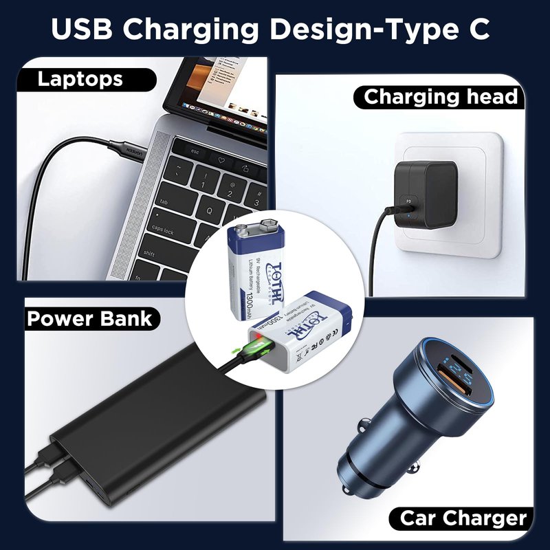 TQTHL 9V Rechargeable Batteries, USB 9Volt 1300mAh Long Lasting Li-ion 9V Battery for Smoke Alarms, Multimeters, Microphones, walkie-Talkie,Toys,Guitar,Keyboard,Metal detectors and More