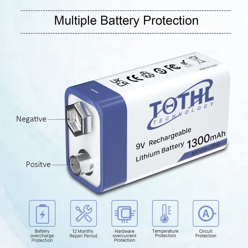 - 【Safe and Environmentally Friendly】 9V lithium-ion rechargeable battery has five-fold protection, intelligent control of the entire charging process, built-in anti-overcharge, over-voltage, over-current and over-discharge protection, which can protect the battery well.
